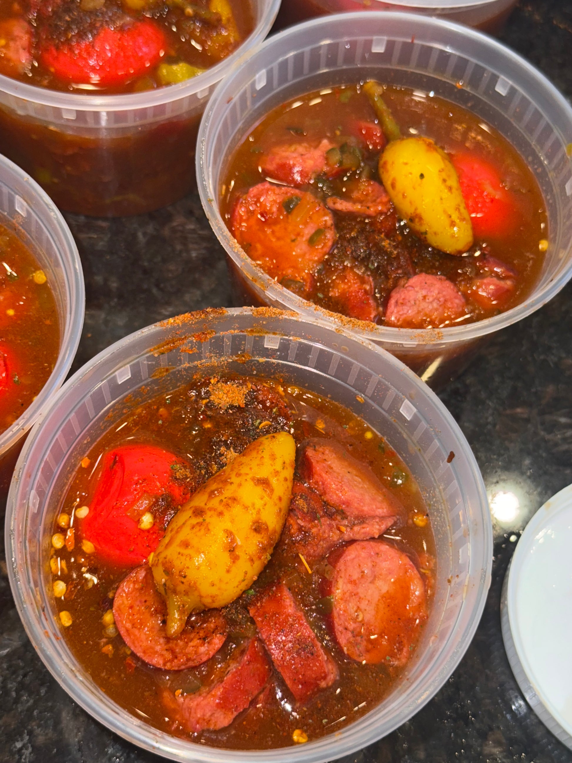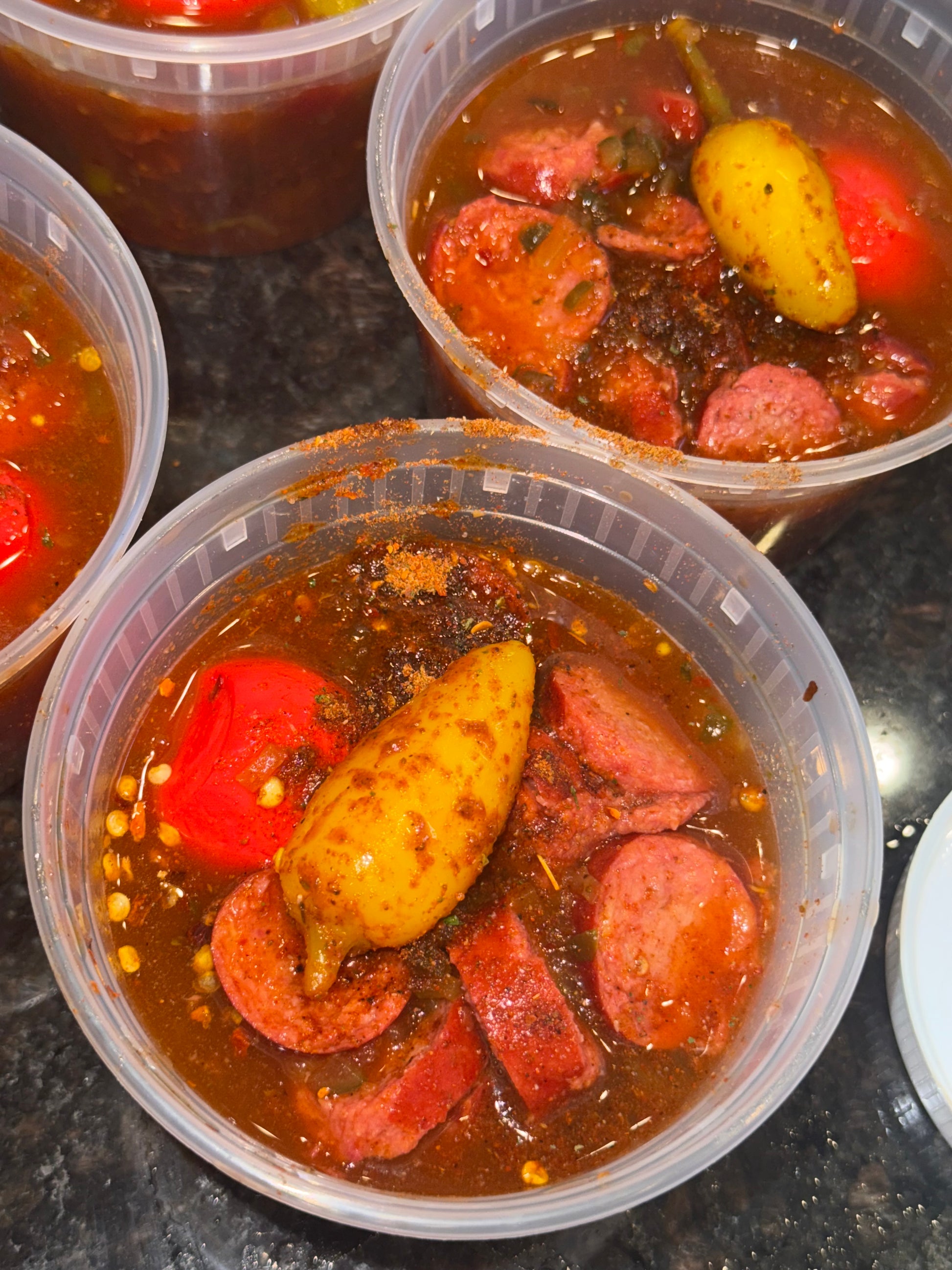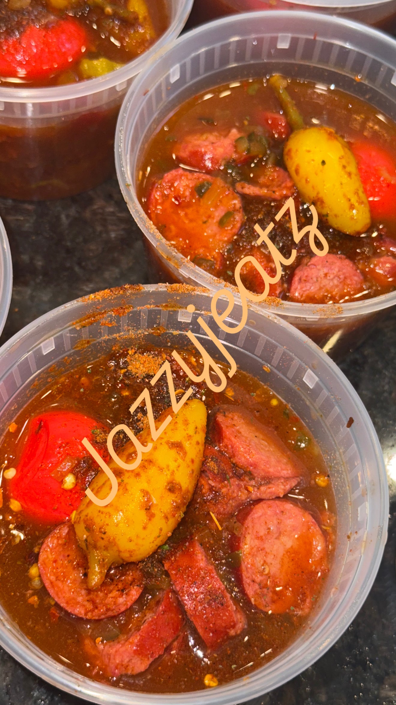 Spicy bowl 1 pickled egg pickled Ā Beef sausage Ā sausage used , jalapeƱo peppers banana pepper rings Pickles all in my special sauce comes with 1 bag of ruffles shake well and enjoy šŸ˜‹