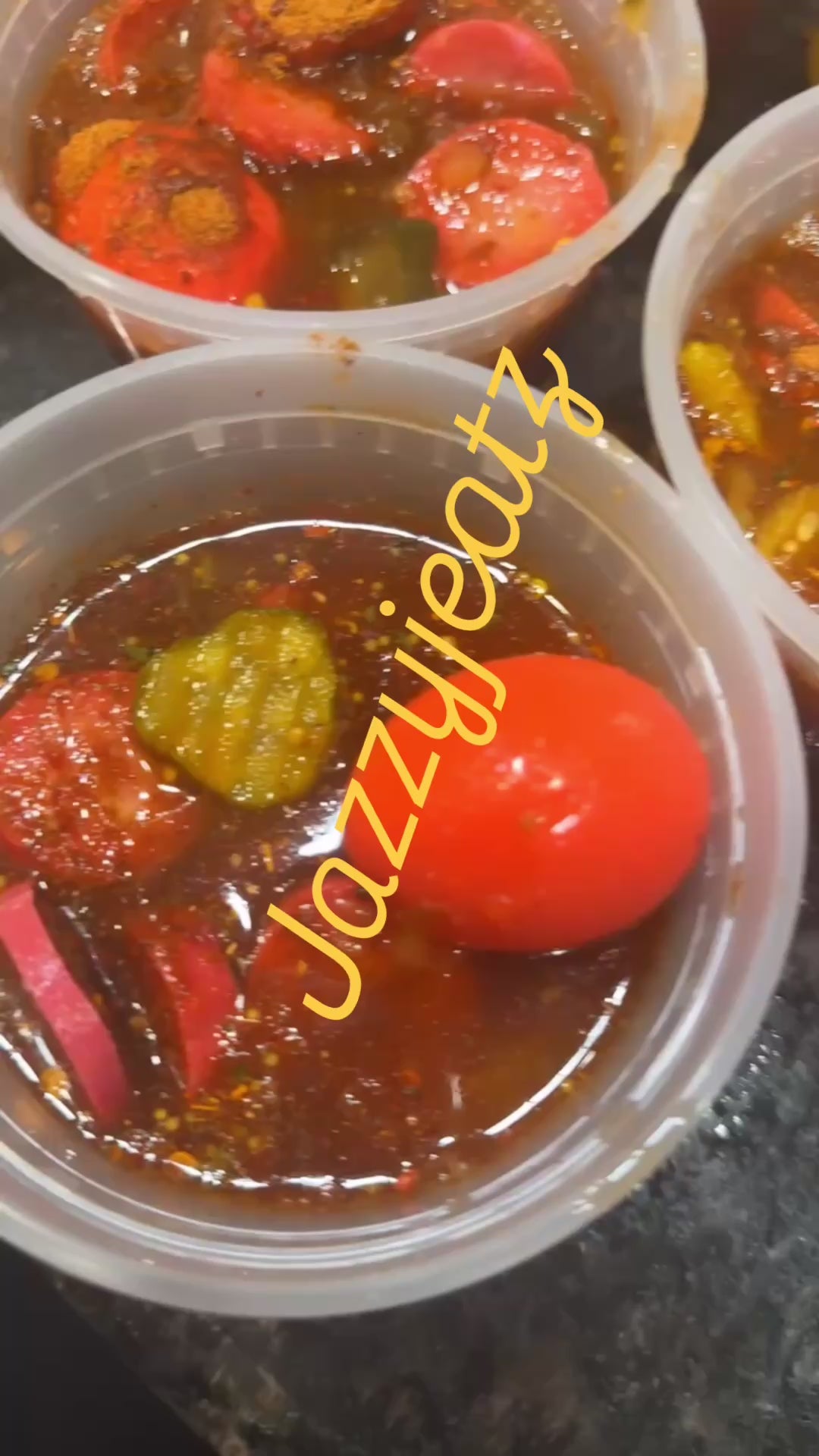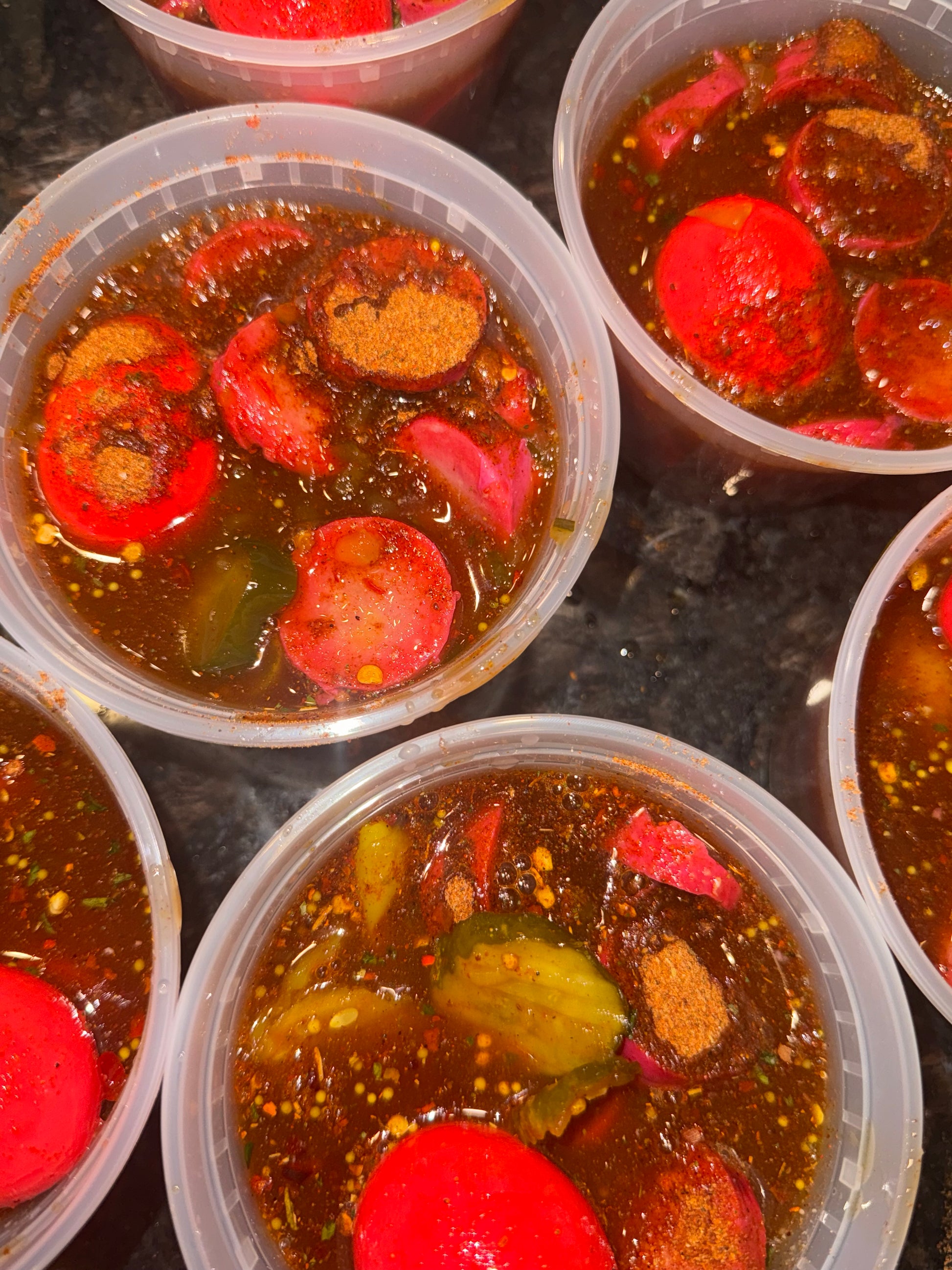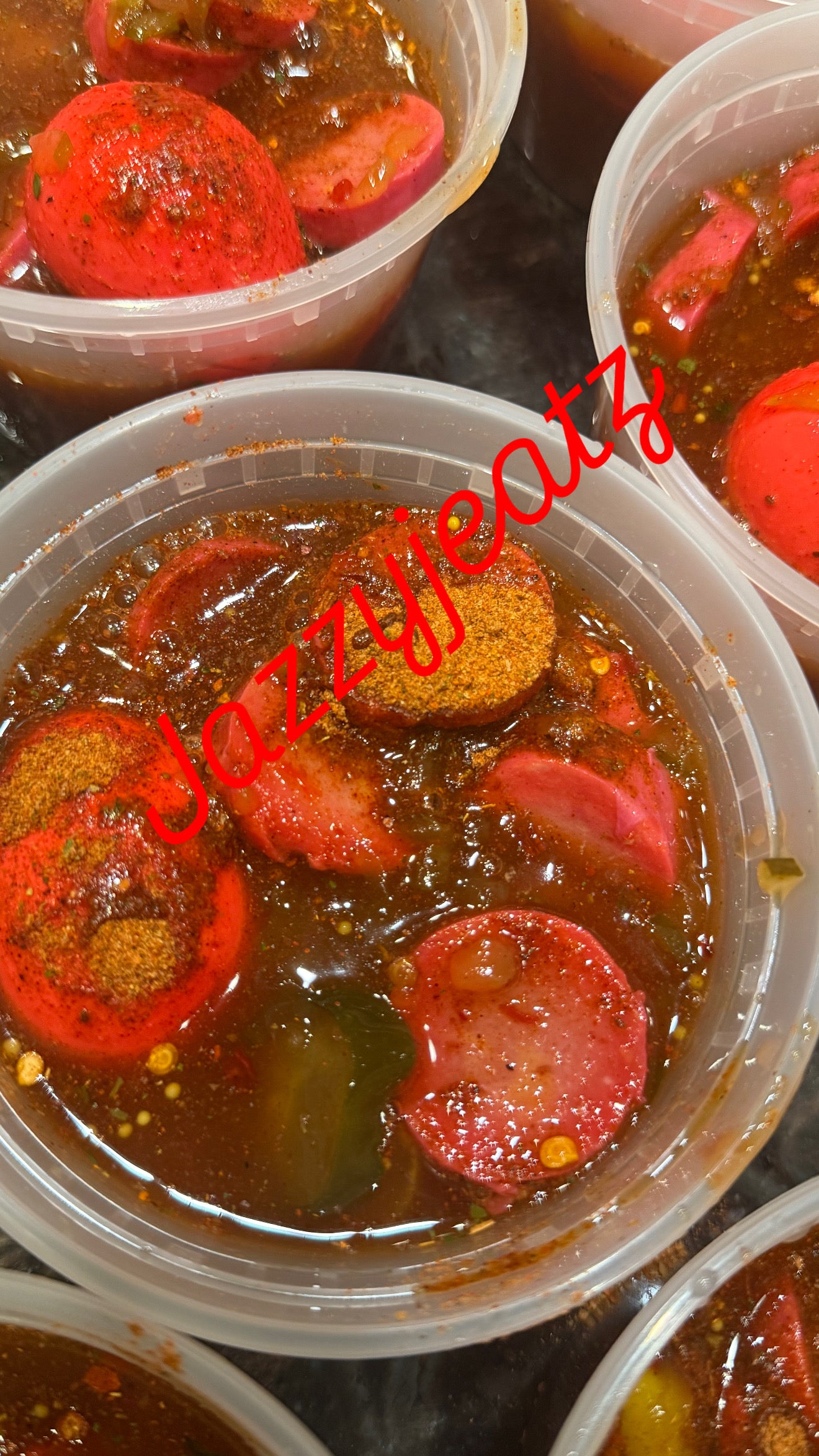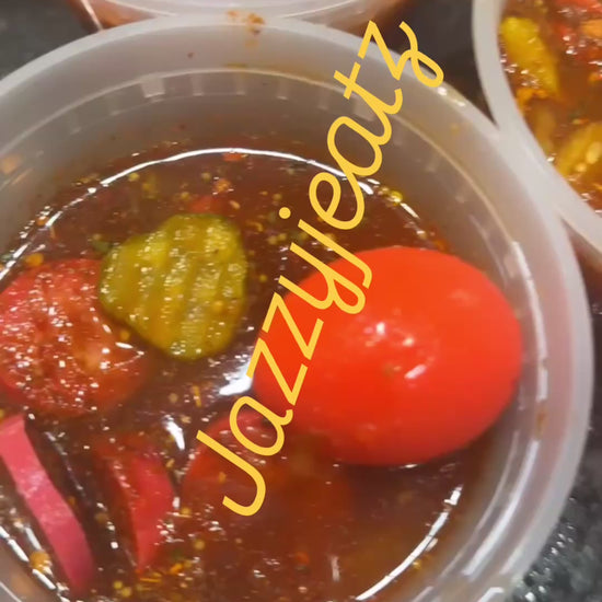 Mild Spicy bowl 1 pickled egg pickled pork sausage sausage used , no jalapeño peppers only banana pepper rings Pickles all in my special sauce comes with 1 bag of ruffles shake well and enjoy 😋