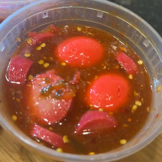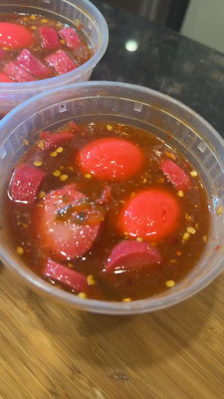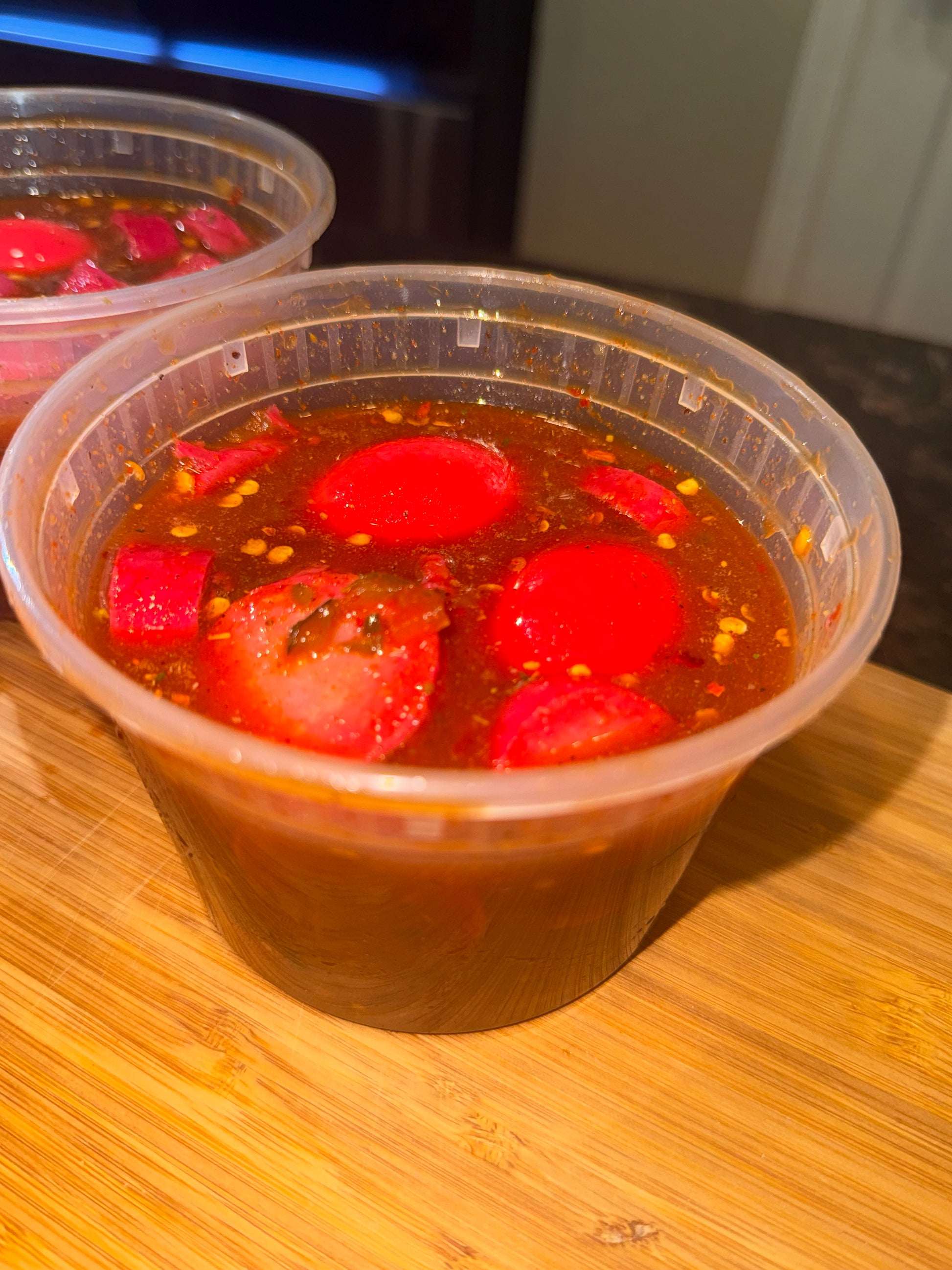 Eggs and sausage Spicy bowl 2 pickled egg pickled Beef sausage sausage used , NO jalapeño or peppers banana pepper rings or Pickles